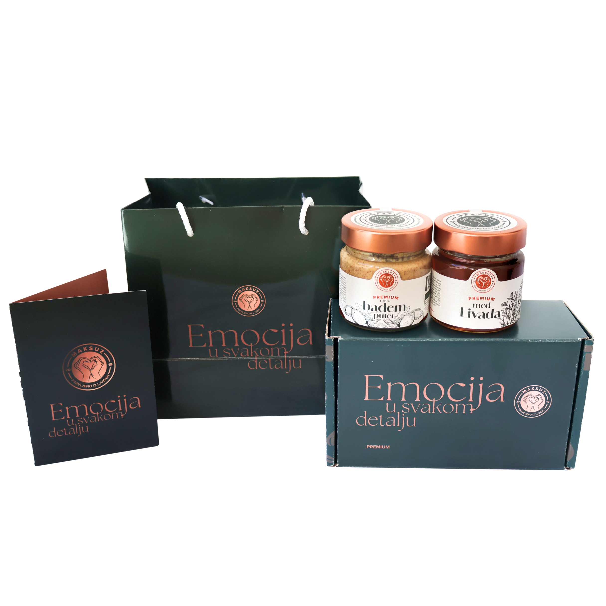 Premium poklon paket iz linije Premium donosi vrhunske proizvode izrađene od najčišćih prirodnih sastojaka. Spoj bogatstva okusa i profinjene jednostavnosti stvara savršen poklon za one koji cijene kvalitet, eleganciju i pažljivo odabrane detalje.